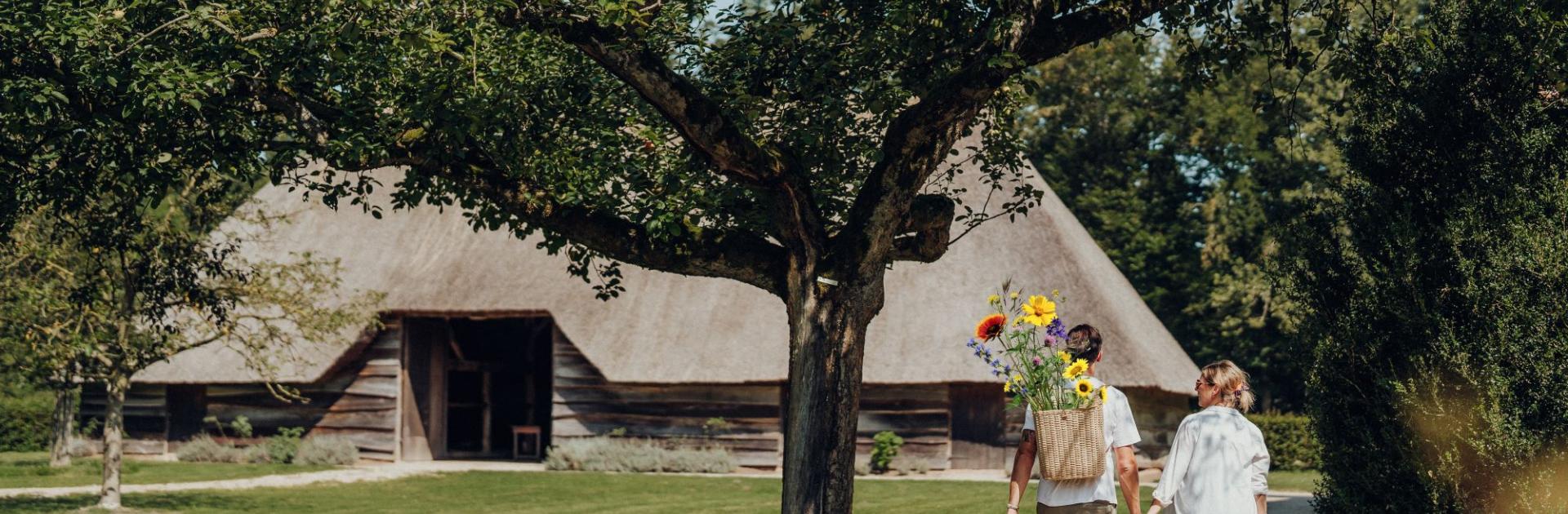 Koppel loopt hand in hand door het Openluchtmuseum met planten in hun rugzak